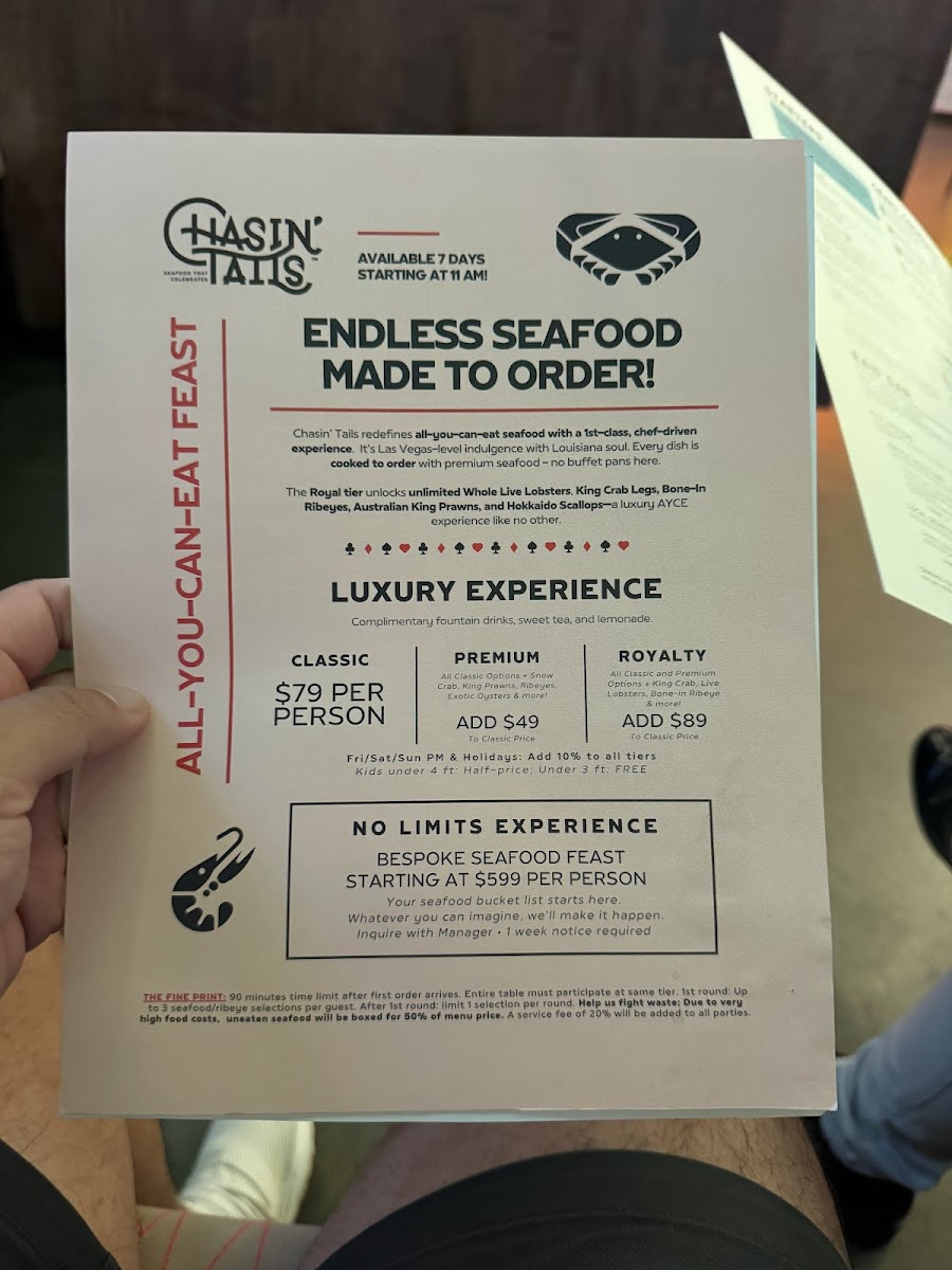 Dining Atmosphere: The atmosphere at Chasin' Tails is as inviting as the food itself. Imagine a bustling marine-themed haven filled with laughter, friendly chatter, and the enticing aroma of fresh seafood wafting through the air. The decor reflects a coastal vibe, further enhancing the sense of escape as you dig into your seafood feast. With attentive staff who make you feel welcomed from the moment you arrive, Chasin' Tails is a place where your dining experience feels both special and personal.